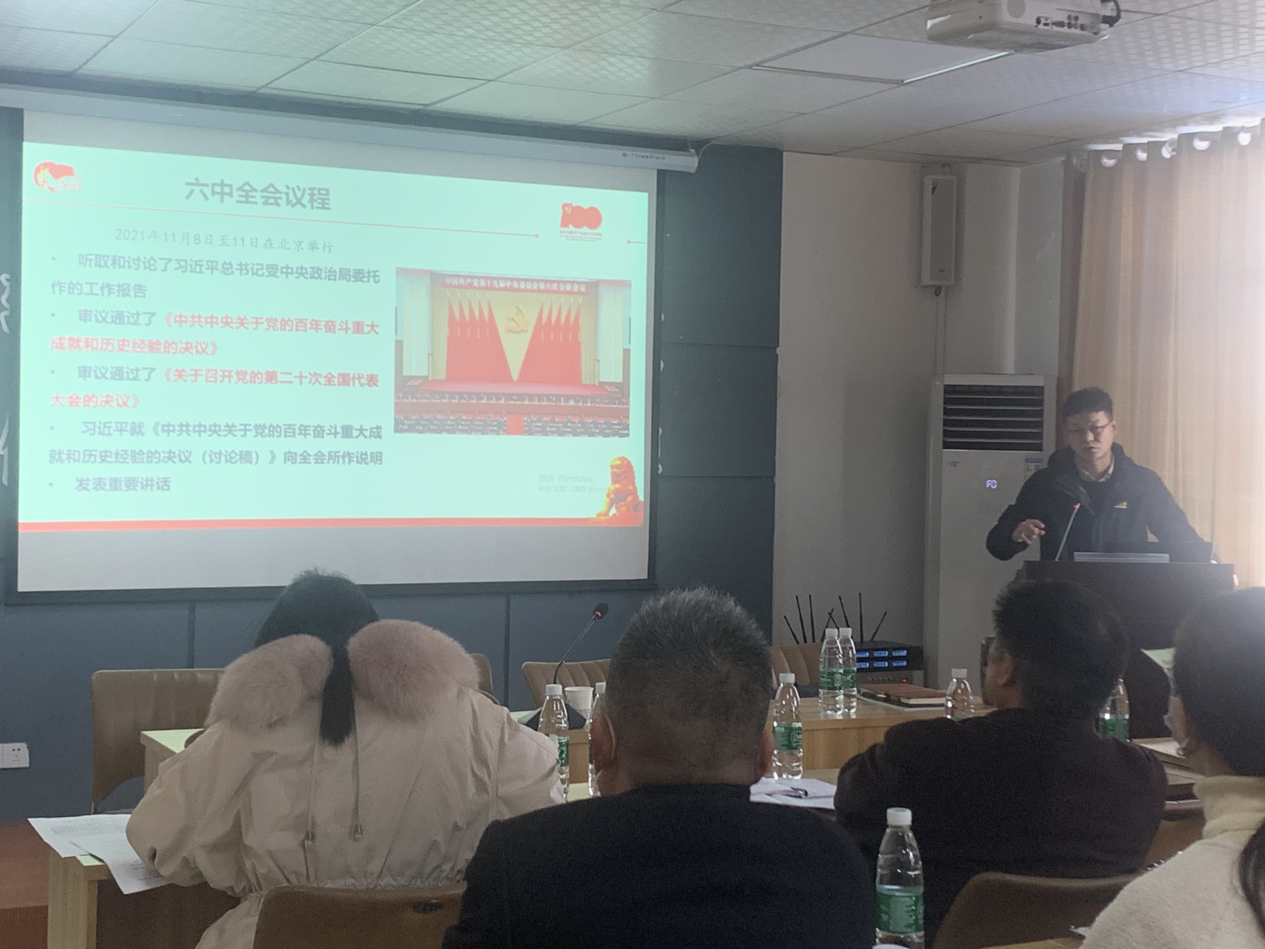 會議主要任務是認真學習黨的十九屆六中全會精神,總結2021年黨建工作成績,安排年末和2022年園區(qū)黨建工作。會議結束后,緊接著請襄州區(qū)委黨校知名講師王拓進老師講授黨課。